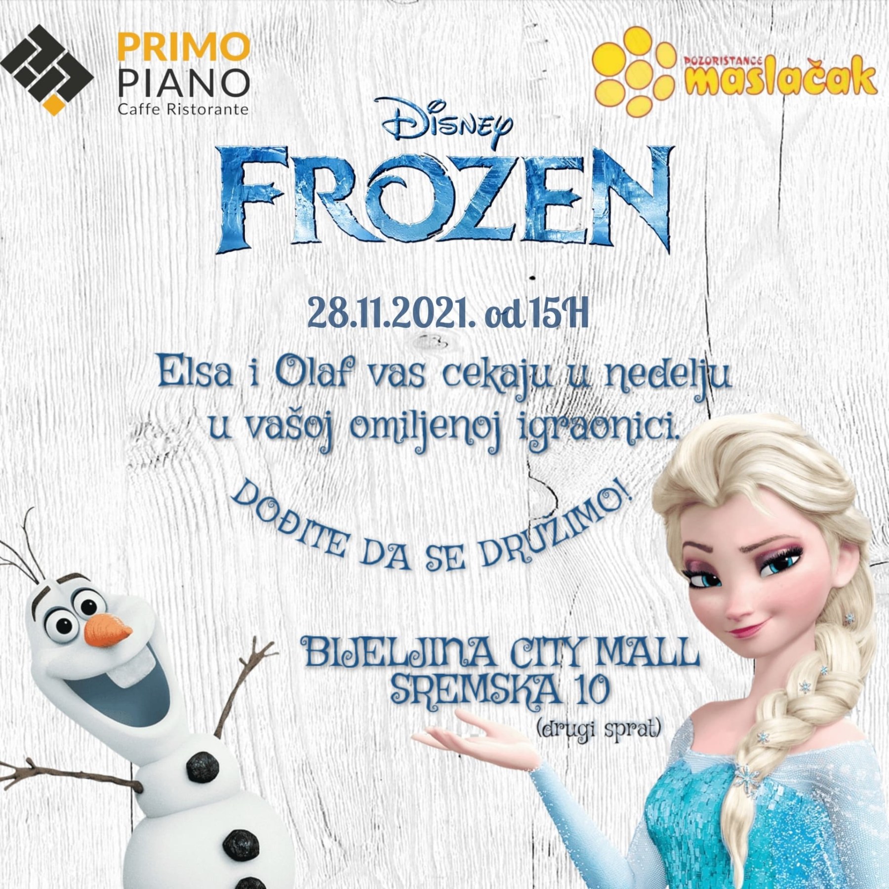 Ove nedjelje, specijalno za vas, vaši omiljeni likovi stižu pravo iz Zaleđenog kraljevstva u dobro poznati Primo Piano koji se nalazi u Bijeljina City Mall-u u Sremskoj 10.