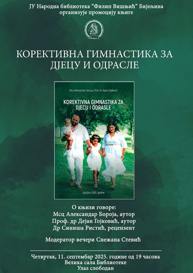 Promocija knjige “Korektivna gimnastika za djecu i odrasle”, čiji su autori Aleksandar Boroja i Dejan Gojković, biće održana 11. septembra u velikoj sali Narodne biblioteke “Filip Višnjić” u Bijeljini, s početkom od 19 časova, a ulaz je slobodan.
