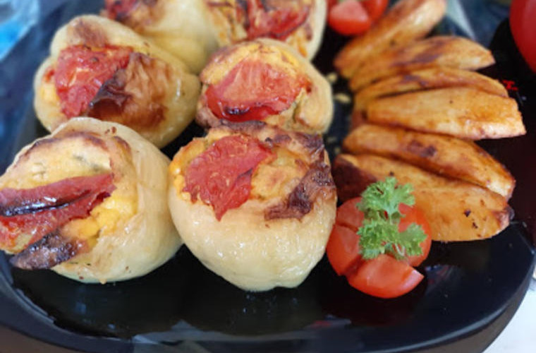 Priprema: Sir izdrobiti dodati jaja, griz, peršun, biber po želji soli i belog luka u granulama 2 kašičice. po želji seckanu mirođiju. Sve izjednačiti. Paprikama izvaditi seme pa ih napuniti nadevom ne sasvim do vrha. Zatvarati tanjim kriškama paradajza. Ostatak paradajza naseckati. Tepsiju podmazati uljem poređati paprike okrenute na gore. Lepo ih premazati uljem i peći oko 50-1 sat vremena na 220 stepeni C da zarumene. Uz papriku možete dodati i pečen krompir.. Savršenstvo ukusa obavezno treba probati recept je vrhunski aktivira sva čula.