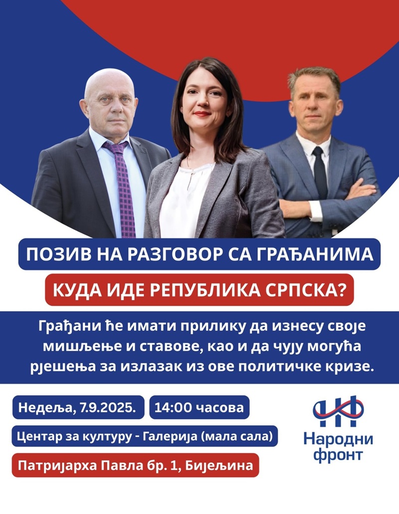 Razgovor na temu “Kuda ide Republika Srpska?” biće održan sa početkom u 14 časova, u Centru za kulturu - Galerija (mala sala), na adresi Patrijarha Pavla 1 u Bijeljini.
