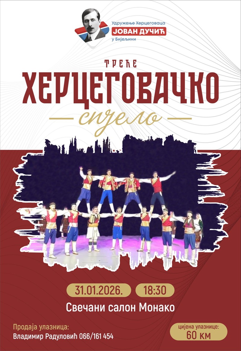 Udruženje Hercegovaca "Jovan Dučić" organizuje 31. januara 2026. godine treće Hercegovačko sijelo u Bijeljini, koje će okupiti sugrađane hercegovačkog porijekla, kao i prijatelje iz Semberije, Majevice i bratskih zavičajnih udruženja.