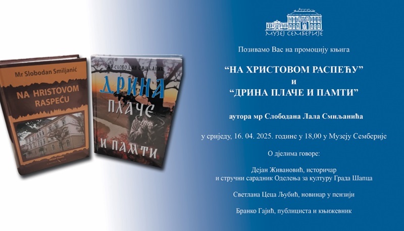 Promocija knjiga “Na Hristovom raspeću” i "Drina plače i pamti”, autora mr Slobodana Lala Smiljanića, biće održana u srijedu, 16. aprila, u 18 časova u Muzeju Semberije.