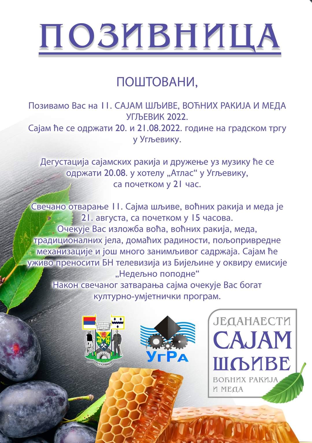Međunarodni sajam šljive, voćnih rakija i meda biće održan sutra u Ugljeviku i okupiće više od 80 izlagača, najavljeno je iz opštinske Agencije za razvoj malih i srednjih preduzeća, koja je organizator sajma.