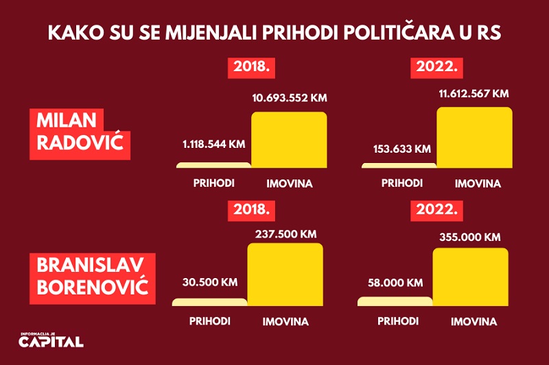 Radović prema najnovijem imovinskom kartonu na računu ima 50.000 KM, a posjeduje i BMW X5 vrijedan 120.000 maraka, dok su mu potraživanja po datim zajmovima i gotovina porasli na 6,4 miliona KM.