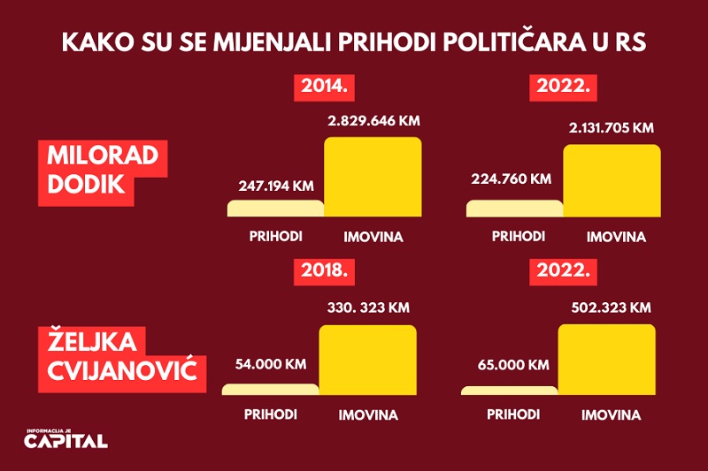 Naime, Dodik je 2014. godine kada je takođe vršio funkciju predsjednika Republike Srpske prijavio da posjeduje kuće u Laktašima i Srbiji vrijedne dva miliona maraka tri stana u Srbiji i Republici Srpskoj u vrijednosti od 740.000 KM, dok je već u imovinskom kartonu iz 2018. godine, kada je biran za srpskog člana Predsjedništva BiH ostao bez dva stana, te je prijavio samo posjedovanje stana u Republici Srpskoj vrijednog 80.000 KM.