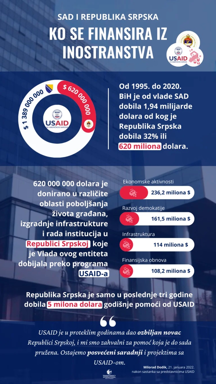 Vlasti Republike Srpske proteklih godina bile su najveći korisnik stranih projekata iz Evropske unije i Sjedinjenih Američkih Država, a zvanični podaci pokazuju da su milijarde stranog novca stigle za podršku demokratskom razvoju, ekonomiji i infrastrukturi. Ipak te iste vlasti sada žele sve nevladine organizacije koje apliciraju na projekte kod istih donatora označiti “agentima stranog uticaja” što predviđa novi zakon o javnosti rada neprofitnih organizacija koji je u formi nacrta usvojen u Narodnoj skupštini RS.