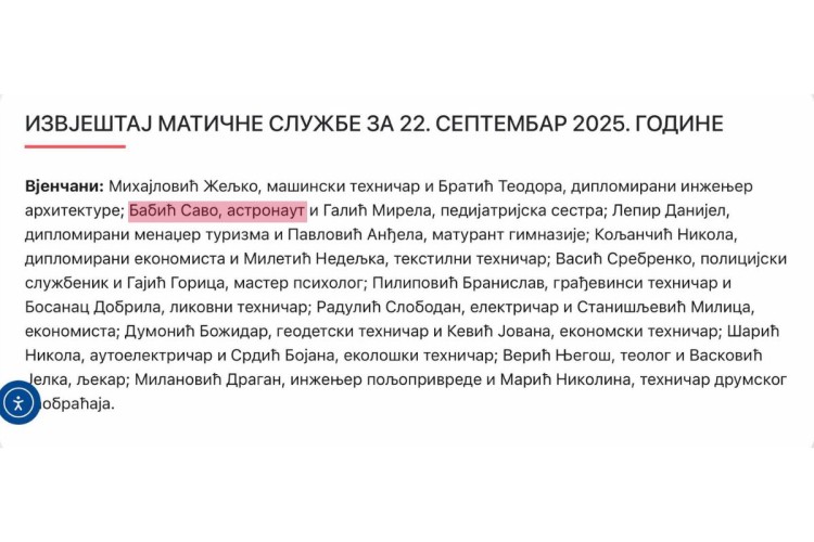 Matična knjiga vjenčanih u Banjaluci od vikenda broji i jednog "astronauta". Naime, u rubriku “zanimanje” mladoženja Savo Babić je, bez mnogo razmišljanja, odlučio upisati upravo to – astronaut.
